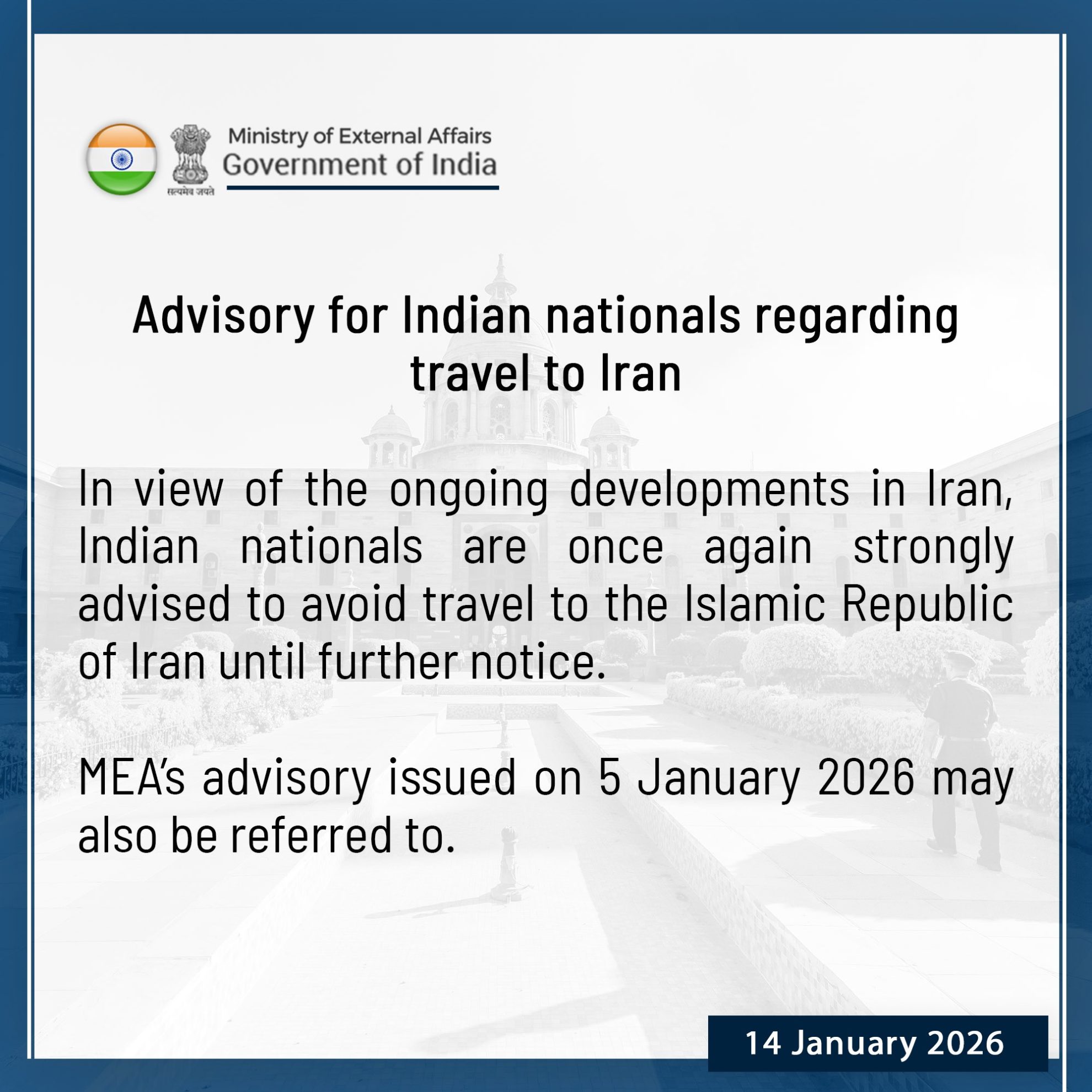 इस बीच, विदेश मंत्रालय ने भारतीय नागरिकों को अगली सूचना तक ईरान की यात्रा से बचने की सलाह दी है। इससे पहले जारी एक परामर्श में मंत्रालय ने भारतीय नागरिकों से पश्चिम एशियाई देश की गैर-जरूरी यात्रा से बचने का आग्रह किया था।