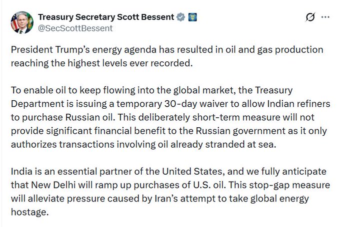 अमरीका के वित्त मंत्री स्कॉट बेसेंट ने भारत को समुद्र में फंसे रूसी तेल की खरीद के लिए 30 दिन की छूट देने की घोषणा की है। यह कदम वैश्विक ऊर्जा बाजार में स्थिरता बनाए रखने के उद्देश्य से उठाया गया है।